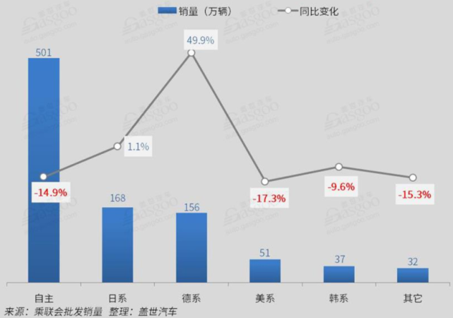 根据中汽协统计的数据,2019年,德系在华的市场份额为24.2%,日系为21.3%;与此同时,中国品牌的市场占比为39.2%。从这一市场份额划分来看,中国品牌头部车企、德系和日系成为乘用车市场的主力,而美系、韩系和法系越来越处于边缘区域。