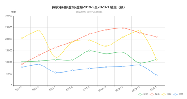 然而,随着探歌和探岳的崛起,途观和途观L的市场地位却受到了威胁。2019年下半年,探岳单月销量平均挤进了2万台的行列,而途观则出现了不同程度的下降态势。