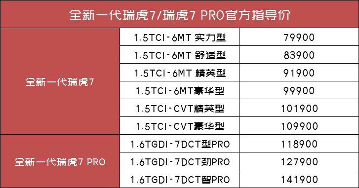 花开两朵,各表一枝。全新一代瑞虎7/瑞虎7 PRO的官方指导价为7.99万元~10.99万元,瑞虎7 PRO为11.89万元~14.19万元两款车型尺寸一致,它们之间最主要的差异在于动力与配置有所不同。
