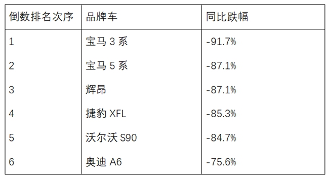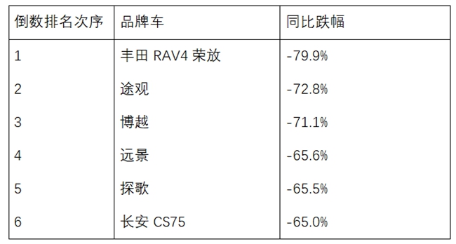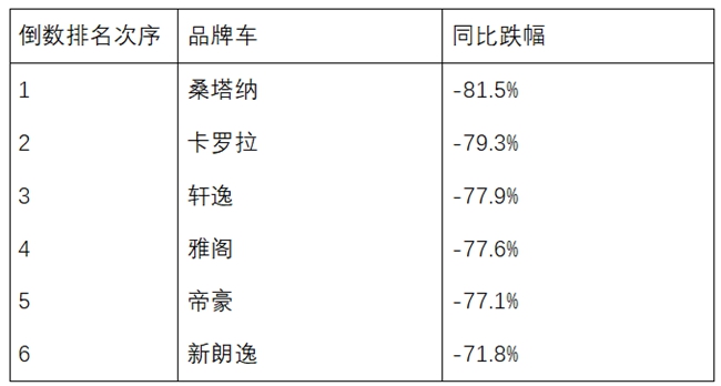 (※以上大数据来源:乘联会,倒数排名根据同比跌幅比例排列,不代表真实销量变化)