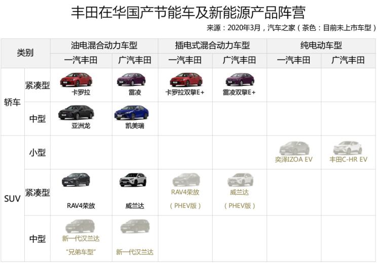 而对大趋势变化反应较快的丰田,通过“油电混动和插电式混合动力两条腿走路,逐渐向电动化扩展”多路线并举的整体产品发展思路,相比其他海外品牌,丰田在轿车和SUV中搭载的汽车动力源的品类数量、应用车级范围及投入时间等综合分析看,都极富“进取心”,尤其是作为基础发展车系的油电混合动力产品阵营,在深耕多年后,先发优势已经形成。