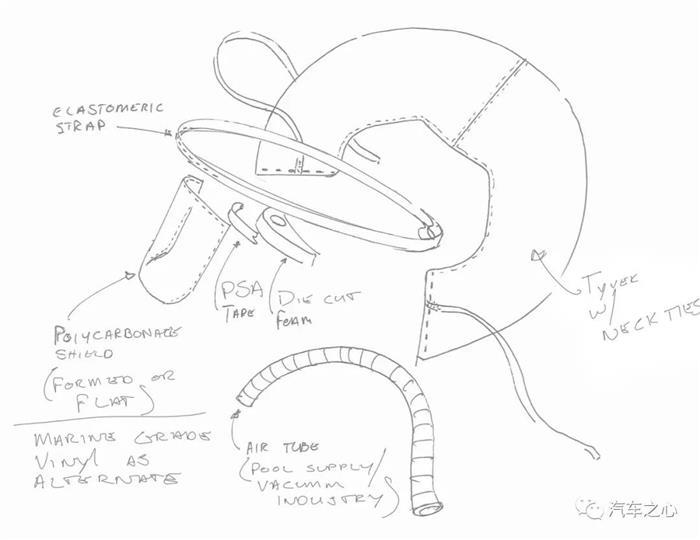 头罩材质使用了简单的高密度聚乙烯合成纸,软管则可以从福特的供应链或者真空吸尘器行业获取。