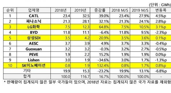在 2019 年动力电池出货量前十的企业中:宁德时代稳居榜首,比亚迪则从 2018 年的第三名跌落至第四。二者之间差距越拉越大。