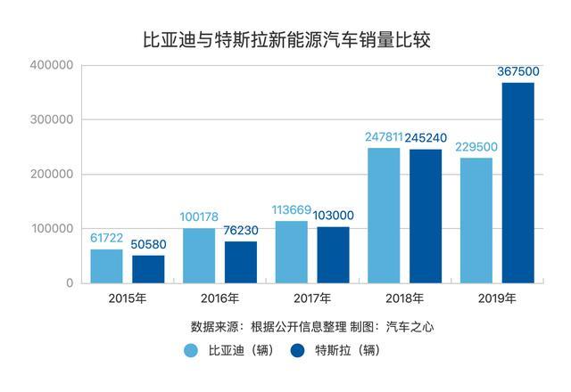 而后,特斯拉在 2019 年以全球销量 36.78 万辆的成绩终结了比亚迪「5 连冠」梦。