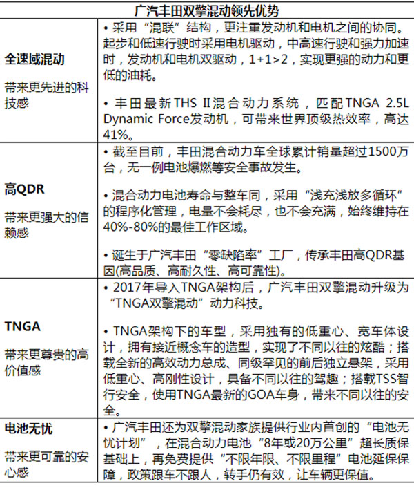 广汽丰田作为国内混合动力市场的开拓者,2010年导入首款混动车型第六代凯美瑞双擎混动,把全球最先进、最可靠的丰田混动技术引入了国内;2012年第七代凯美瑞双擎混动上市,以领先的混合动力技术,树立豪华、环保、时尚的混动新标杆;2017年重磅推出TNGA第八代凯美瑞双擎混动,全面响应消费者对个性化、豪华感及高品质轿车的需求。雷凌双擎混动的上市,令产品线进入容量最大的中级车市场,并抹平与同级普通汽油车价差,掀起混合动力的普及风暴。新成员威兰达双擎混动技术再升级,在“TNGA双擎混动”动力总成基础上,搭载全新E-FOUR电子四驱系统,助力广汽丰田开拓SUV混合动力市场,“混动世家”强势扩容。今后,双擎混动将成为广汽丰田TNGA产品线标配,后续导入的所有TNGA车型,都将提供双擎混动版本。