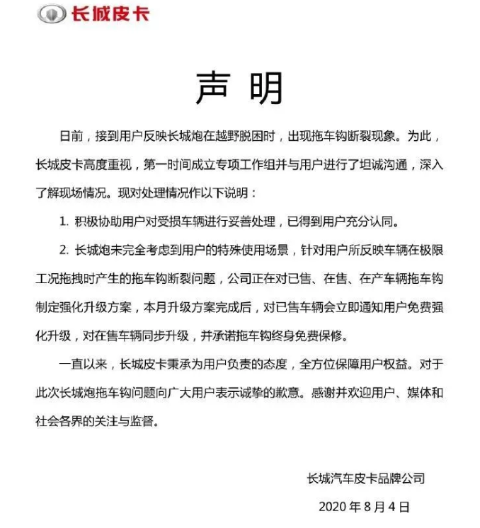 突如其来的事件,引起了消费者和业内人士的强烈关注,而长城皮卡也在第一时间做出了响应,发表声明,并提出解决措施。