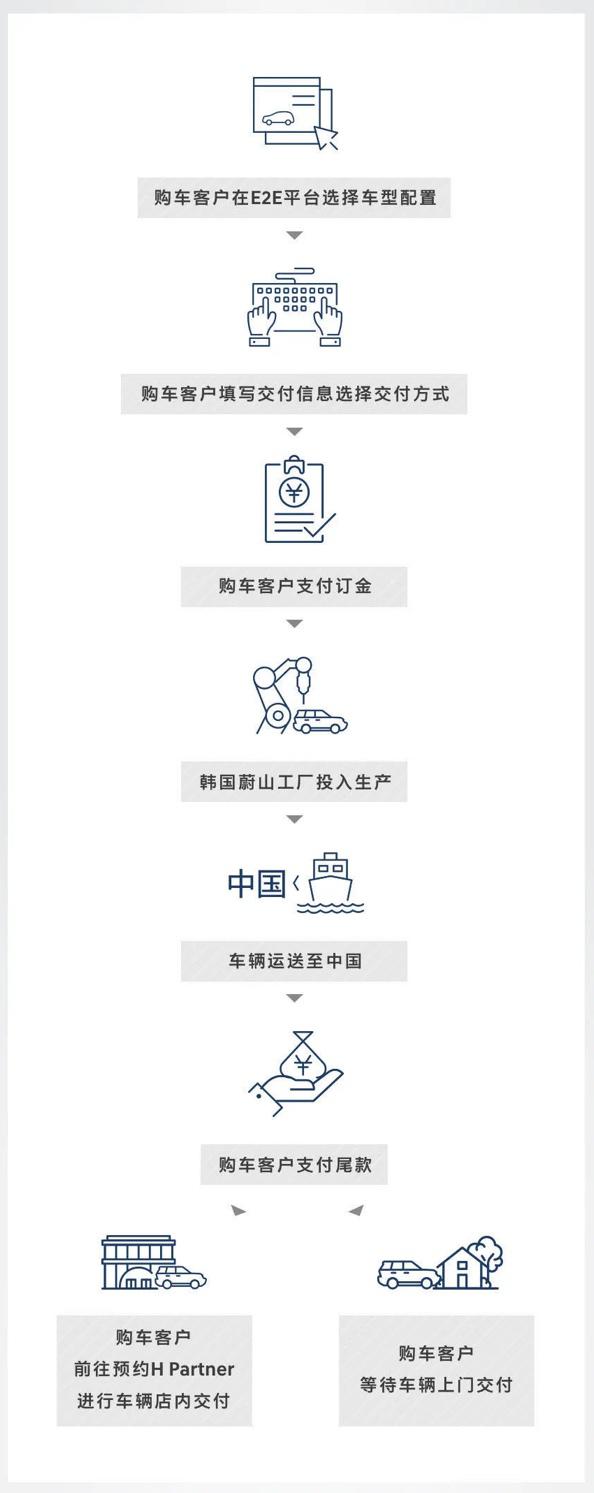 无需繁琐的流程,现代进口汽车官方网站线上购车系统(E2E)平台提供预约试驾、开始订购、线上支付等一站式服务,一键式下单,让你从此购车更便捷!客户在线上购车系统(E2E)平台选择心仪的车型及配置,填写交付信息并选择交付方式,支付订金,韩国蔚山工厂随即投入生产并将车辆运送至中国,客户再支付尾款,前往预约的现代进口汽车合作体验店H Partner提车或等待车辆上门交付。从签约下单到喜提爱车的全流程,“网购”一辆帕里斯帝(