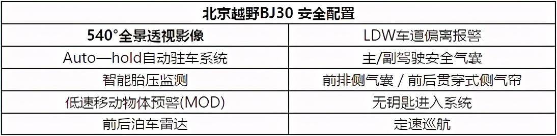 除了硬朗造型和强悍通过性外,从配置表来看,北京越野BJ30对安全科技的应用毫不吝惜。新车融合了前后泊车雷达、低速移动物体报警系统(MOD)、车道偏离预警系统(LDW)、盲区监测系统(BSD)等诸多智能安全科技,让整个户外旅途多一份便利与安全。以低速移动物体报警系统(MOD)为例,该系统利用全景影像高清摄像头,在车辆停止或低速行驶时自动检测视车辆周围区域,当车辆周围有移动物体或行人通过时,系统通过图像提示驾驶者注意车辆周边安全,有效提升驾驶安全性。