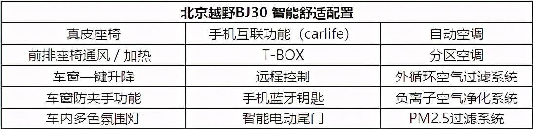 为了打造舒适座舱, BJ30在智能舒适配置上下足功夫,其家族“暖男”风格从中可见一斑。具体来看,多功能真皮座椅,兼具电动调节、通风加热、联动外后视镜座椅记忆、迎宾功能。超大全景天窗,总面积达1.59㎡,开口面积0.84㎡,同时并支持远程开启、语音控制开启。多色可调的氛围灯可随音乐变化起伏,备显舒适和温馨。智能电动后尾门,拥有车内按键、尾门按键、踢脚感应、语音控制、远程开启等5种开启方式,带来人性化的体验。空调配置上,拥有包括PM2.5过滤系统和负离子空气净化系统在内的健康科技,丝毫不亚于主流SUV。