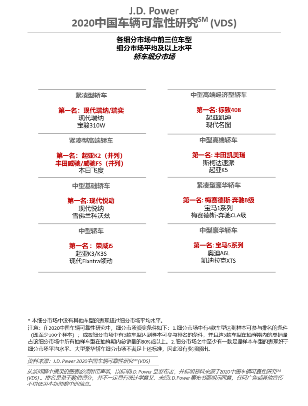 共有19款车型在2020年中国车辆可靠性研究中摘得细分市场奖项。