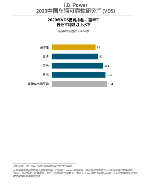 保时捷(95 个PP100)荣获豪华车品牌车辆可靠性第一名。奥迪(97个PP100)排名第二,宝马(101个PP100)位列第三。