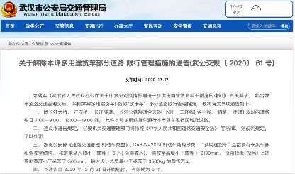 近日,武汉交警正式发布《关于解除本埠多用途货车部分道路限行管理措施的通告》,通告自2020年12月21日开始施行。有效期为5年。