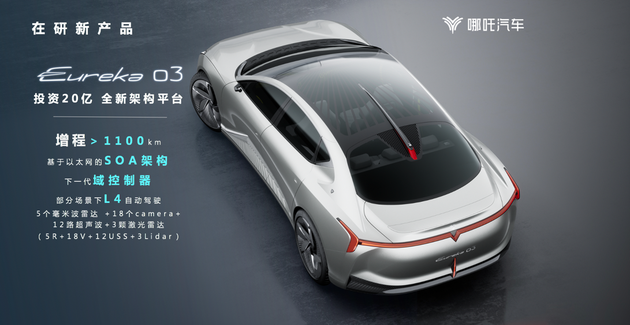 基于Eureka 03概念车打造的量产车型,也将在2021年上海车展亮相。Eureka 03量产车基于哪吒汽车投资20亿元的全新架构平台打造,其增程里程超过1100km。Eureka 03量产车将配备3颗激光雷达、5颗毫米波雷达、12路超声波、18个摄像头,在下一代域控制器基础上,Eureka 03量产车在部分场景下将实现L4自动驾驶。并且,基于以太网的SOA架构,Eureka 03量产车将会持续进化,实现车辆全生命周期OTA软件升级及功能多样化,满足不同消费者不同时期的个性化需求。