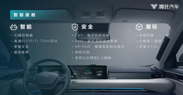 在智能座舱方面,哪吒汽车加大AI域控制器研发力度,搭载高通8155P/TI TDA4车规级智能芯片,通过CMS电子外后视镜、OMS座舱视觉监控系统、AR-HUD增强现实抬头显示、车拍抖音以及游戏小程序等功能的实现,打造更加智能安全、更加智能娱乐的座舱。