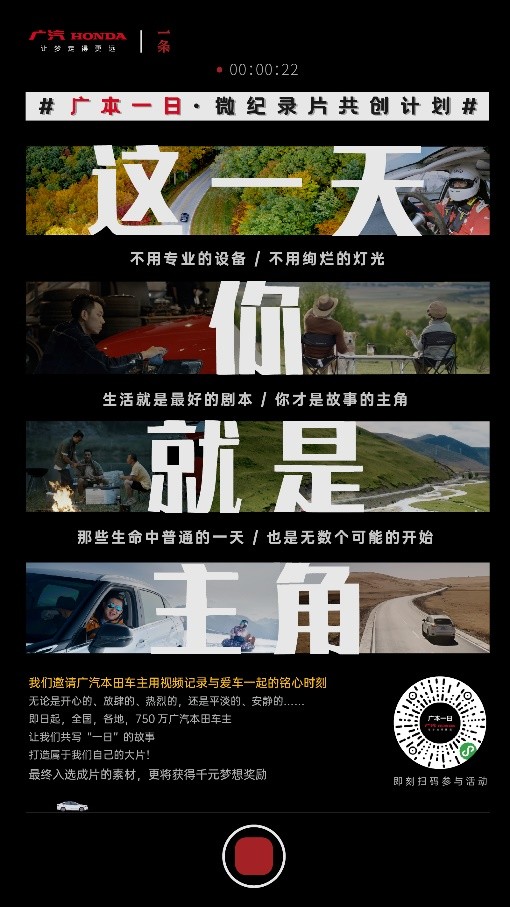 用心发掘车主故事,陪伴并鼓励他们勇敢追梦、分享精彩生活,2020年,广汽本田面向全国车主启动了“广本一日”微纪录片共创计划,征集车主和粉丝共创“一日”的故事,激励他们展现生活精彩的一面;这个活动以“这一天,你就是主角”为主题,让广汽本田车主成为故事主角。没有预设的脚本,车主和粉丝既是编剧、导演,同时也是故事主角。广汽本田作为组织者,让车主自发拍摄生活的点滴,以最真实的镜头展现出他们最真实的生活和梦想。积极@每一位敢梦人,广汽本田以汽车为媒介,与他们产生更多情感共鸣,逐梦更精彩的人生。