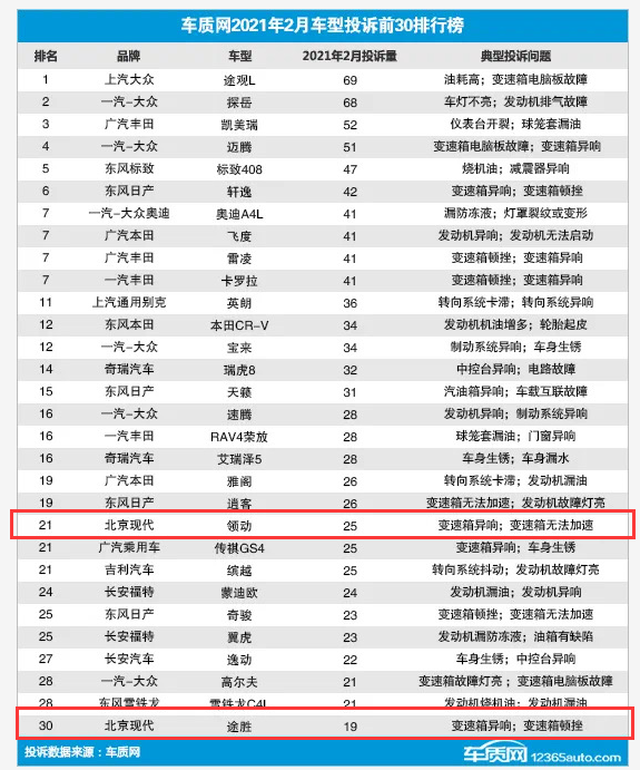 不仅如此,根据车主反馈显示,现代途胜目前还存在着较为多发的变速箱异响、变速箱顿挫等问题。在车质网发布的2021年2月份车型投诉榜单上,这款车型名列TOP30。