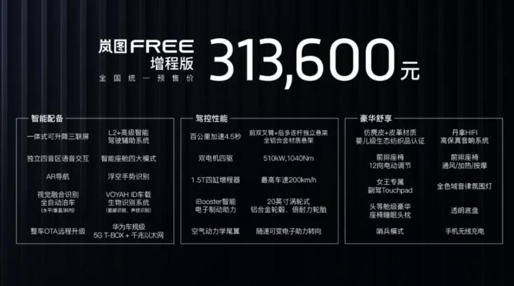 岚图FREE有增程式与纯电动两种动力形式,重点在于预售价为31.36万元的入门级版本为增程式驱动,拥有4.5秒的百公里加速能力,并且是四轮驱动,这就意味着入门级版本也有着百万级车型的动力体验。