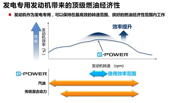 e-POWER是一种不用充电的电动技术,带来纯电车一致的静谧性和强劲动力体验的同时,配备了一台专注于发电的发动机,热效率达到了50%,实现高效发电,比普通燃油车40%左右的效率高多了。