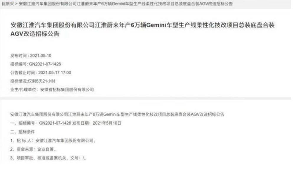 在5月份时,一份关于招标公告曝光,显示了蔚来汽车已经在合肥启动了新车型的开发项目,新车型命名为Gemini,中文名为双子星,预计月均生产5000辆,年产量将达到6万辆。而“Gemini”很有可能是车型代号或项目名称,不代表新车的最终命名。