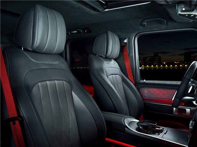 红黑对撞设计还延续进车内,黑色火焰纹开孔型岑木木饰,带钻石菱格花纹的珠光钛灰色/黑色Nappa真皮主动式多仿型座椅,不但营造出豪华的驾舱氛围,还搭配G manufaktur红色 安全带,于细节处流露炽烈个性,瞬间点燃驾驶激情。G 500 炽炎特别版的Nappa皮饰方向盘、仪表台均采用双色设计,视觉元素更加丰富。副驾驶座椅前方的真皮越野扶手左侧“1/500”字样无声宣告其为全球限量版,尊贵身份不言而喻;越野扶手右侧“G manufaktur”字样则代表TA源于格拉茨工厂的个性化定制,由全球最顶尖工匠大师花费110余个工时手工组装,豪华品质与细腻手感独树一帜。