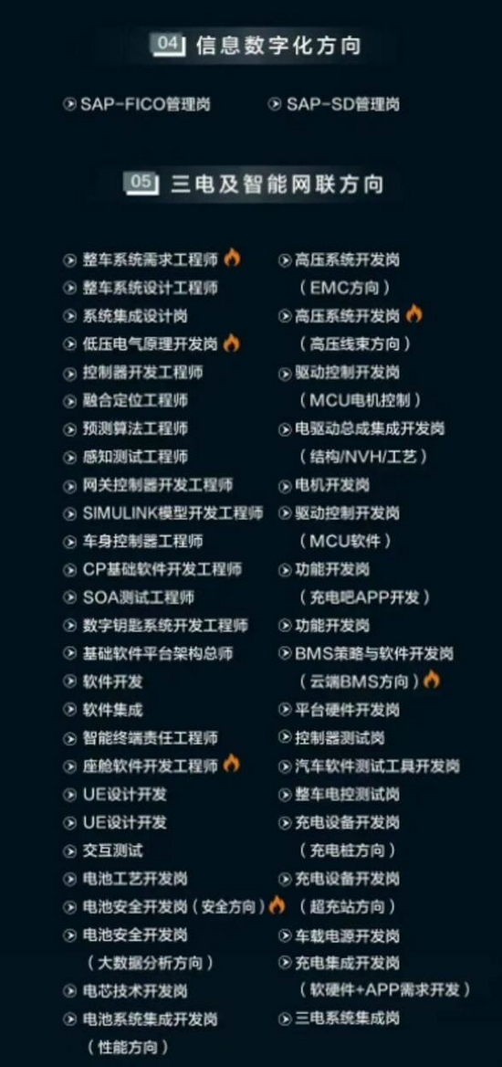 具体来看,三电及智能网联方向人才需求重点集中于高端技术层。系统工程师、算法工程师、测试工程师、软件开发与集成、软件平台架构总师、充电设备开发、车载电源开发、高压系统开发、数据平台架构师等高端技术岗位超40个,可见北汽蓝谷在高端人才方面处于急聘状态。