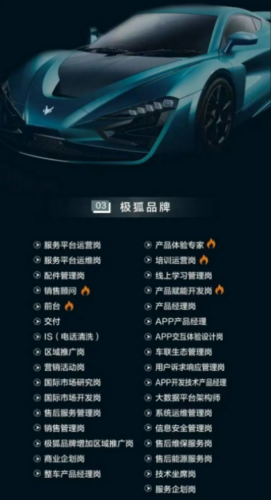 另外,北汽蓝谷重点打造的高端业务线——极狐品牌的人才需求主要集中于产品与品牌推广层。国际市场开发与研究、商业企划、区域推广、营销活动、产品经理以及产品体验专家等岗位涉及人才缺口超30个。酒香也怕巷子深,这从北汽蓝谷在极狐品牌的推广与渠道扩充的招聘规模上足以见得。