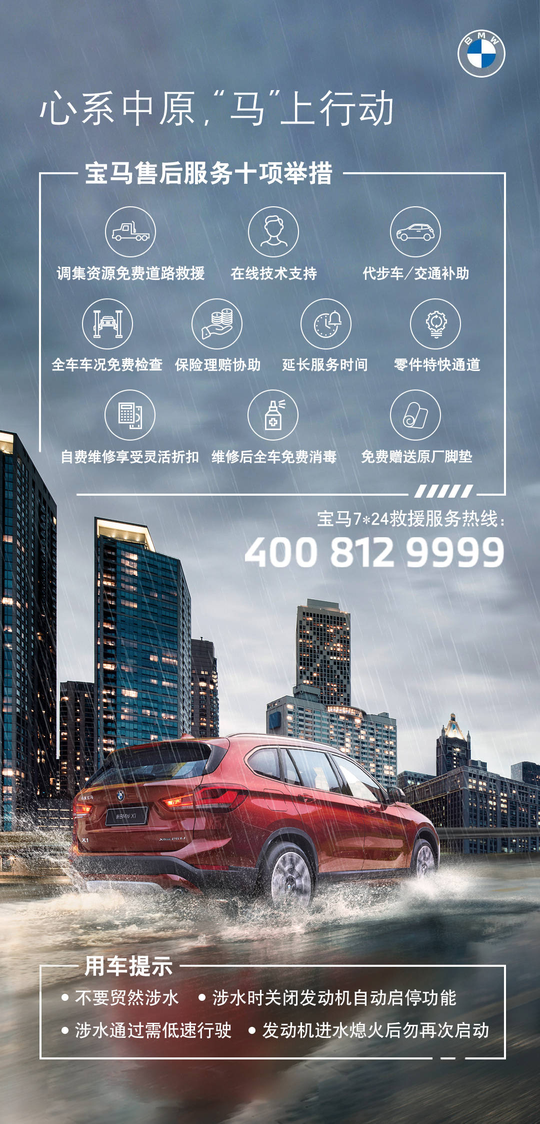 此刻,宝马正在尽一切力量调集周边省市的救援资源,包括车辆、人员和物资,尽全力为当地用户提供无偿紧急救援服务,并为当地受损车主提供十项应急服务举措。