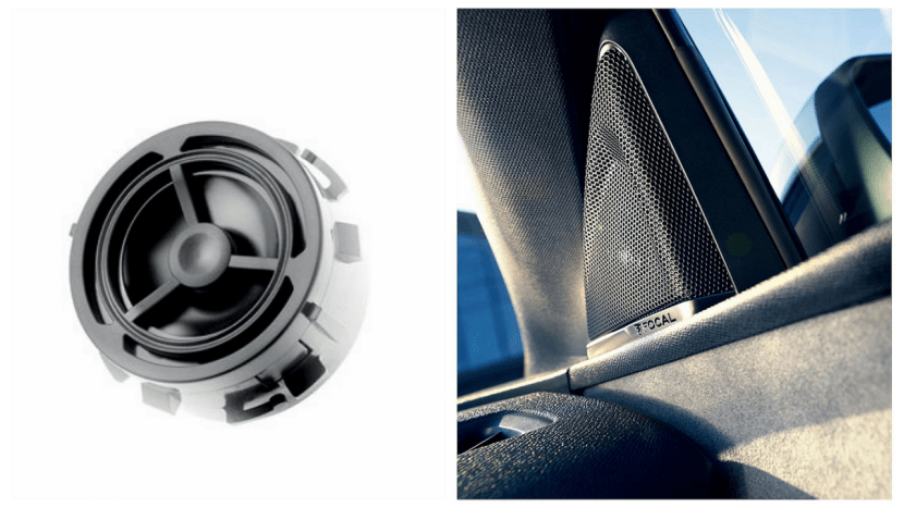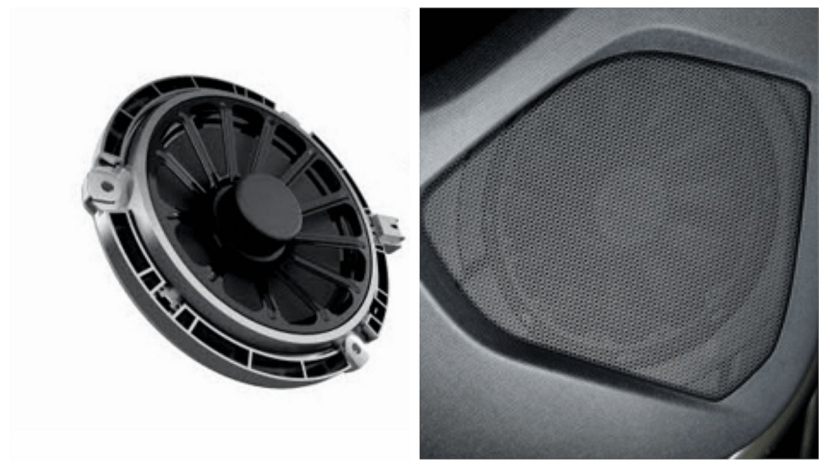 4个中低音喇叭的直径是165mm,安装在车门面板内。另一个则是安装在中控台的顶部做中置单元。在技术上,中低音单元是纤维素纸浆材质,采用了Polyglass椎体结构,可以将纤维纸盆的阻尼属性以及玻璃纤维的刚性融为一体,以为高清晰度音响提供具有示范线性的频率响应曲线。这里的频响曲线是指音响的真实还原度。