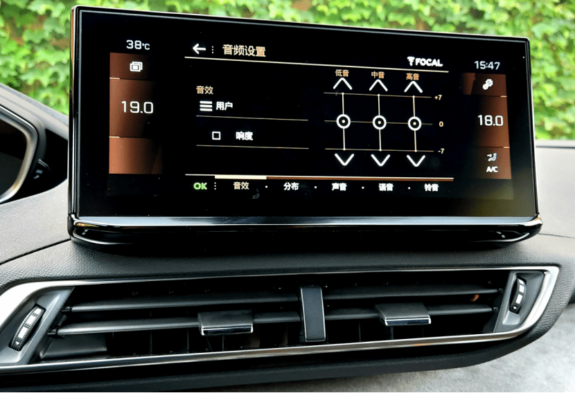 在Focal劲浪的参与下,标致全新4008在音效上,可以调节低音、中音、高音的增益幅度,各有14个挡位。在分布上,可以调节中声道和低音炮的增益。比如,打算播放听人声、女声为主的歌曲时,可以调节中音道,这样人声会更加突出。遇到动次打次的低音歌曲时,还能调节低音炮助兴。