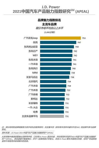 广汽菲克Jeep(753分)获得主流车品牌第一,别克(747分)和东风悦达起亚(744分)分别排名第二和第三。