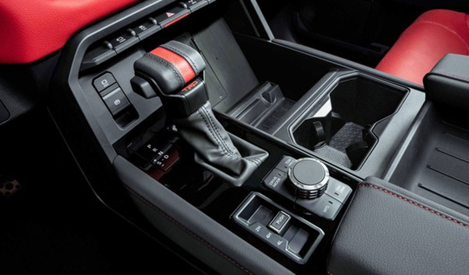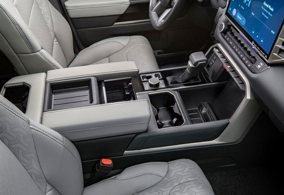 内饰整体相当简洁,使用的冷色调衬托出一种硬朗的感觉。液晶仪表盘及大尺寸的中控屏大幅提升了车内的科技化氛围。而TRD Pro版本车型则阿就扔了很多红色缝线和TRD Pro字母标志,既彰显了其特殊的身份,又提升了一定的运动氛围。
