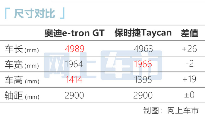 与同平台的保时捷Taycan相比,奥迪e-tron GT整体尺寸与之非常接近。动力方面,奥迪e-tron GT quattro综合最大功率为350kW,增压模式下可以达到390kW,综合峰值扭矩为630N·m。e-tron GT搭载容量为93kWh电池组,支持最高270kW快充模式,可在23分钟内将电量从5%充到80%,并且也可以实现充电5分钟行驶100km。