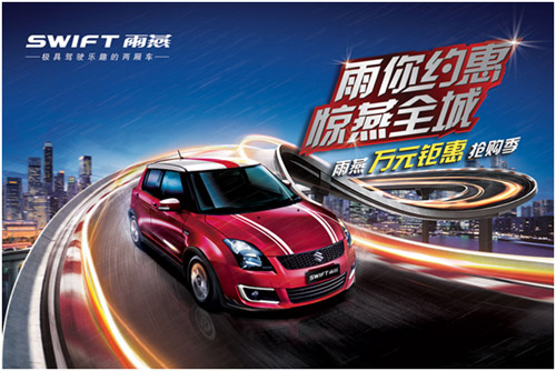 雨燕是铃木引入中国市场的第一款全球战略车型,外形酷似MINI COOPER,时尚、炫酷、动感,饱含动力美学设计元素,一直以来引领着国内小车市场的时尚潮流。为迎合消费者需求,雨燕推出了“冬恋版”、“粉燕版”、“墨客版”等系列限量版车型,大玩色彩营销,培养了大批追求时尚潮流的粉丝,尤其是近期推出的“双色版”雨燕,酒红色车身搭配皓月白点缀,激情、动感,惊艳市场,深受年轻人群的追捧。