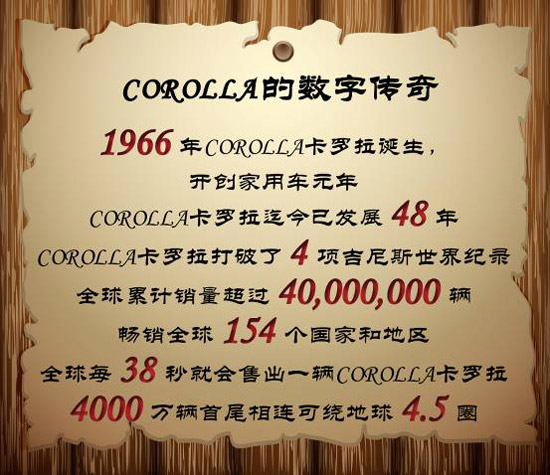历经10代传承;畅销全球154个国家和地区;累计销售超4000万辆,相连可绕地球4.5圈;平均每38秒就售出一辆;创造“最畅销的汽车”、“史上第一款销量突破3000万辆的车”、“生产最多的车”等四项吉尼斯世界纪录四项吉尼斯世界纪录……这一串荣耀的数字既成就了卡罗拉在世界汽车史上的“家轿之王”地位,也是其他任何一款车都无法超越的丰碑。