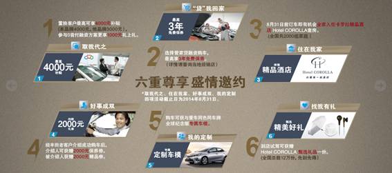 全新第11代卡罗拉上市后,一汽丰田推出了“六重尊享盛情邀约”活动,其中“谢谢等我”、“我的搭档”和“住在我家”面向所有购车用户,“贷我回家”面向贷款用户,而“取我代之”面向置换用户。