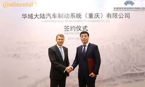 中国,重庆,2015年6月9日。全球领先的汽车零部件供应商大陆集团秉持“扎根中国,服务中国”的战略,持续投资在华布局,贴近客户并满足中国市场快速增长的需求。大陆集团今天在重庆正式宣布与华域汽车股份有限公司(下称“华域汽车”)共同投资新建华域大陆汽车制动系统(重庆)有限公司。来自大陆集团和华域汽车的高管共同出席了新厂合作的签约仪式。