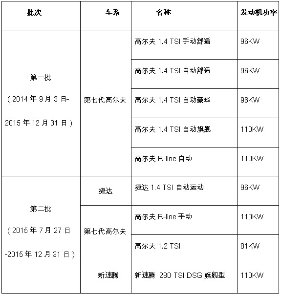 自2015年7月27日至2015年12月31日(以发票日期为准,含当日),除第一批享受节能补贴的车型之外,凡购买《“节能产品惠民工程”节能环保汽车推广目录(第二批)》中所列一汽-大众大众品牌车型(如上表),完成上牌,并签署《节能汽车财政补贴确认书》的消费者,同样可获得一次性3000元的节能汽车定额补贴。