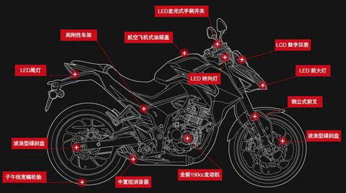 高刚性车架、倒立式前叉、波浪型前后碟刹盘碟刹、子午线宽幅轮胎等,构成了全新CB190R、CBF190R。轻量紧凑,具有高水平操纵稳定性。赛车独有的理想前后分担荷重50:50的比例的应用,以及轻量化技术的投入,使全新CB190R、CBF190R实现了最佳重量分配比,不仅拥有与以往150cc车型同等的重量,而且,在确保操控轻快感的同时,还可提高直线行驶稳定性,为骑手们带来前所未有的驾驶自由感、灵活感和安心感。