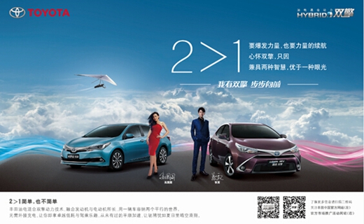 为了能让更多中国消费者喜爱丰田油电混合双擎动力技术,自去年开始,丰田以"我有双擎步步向前"为核心沟通概念,通过线上互动与线下体验,开展了大规模的市场推广活动,并力邀低调男神张震与国民女神高圆圆担当推广大使。今年4月起,国际知名创作型歌手Taylor Swift 泰勒・斯威夫特搭档钢琴巨星李云迪共同出演丰田双擎广告大片,向广大消费者呈现出两种才艺的完美混合。