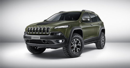 First up, the Cherokee KrawLer was designed to "tackle the toughest driving conditions" so it has been equipped with skid plates, extended fender flares, a raised suspension and BF Goodrich KM2 off-road tires. The model also has a Matte Green exterior, silver mirror caps and a black hood decal.